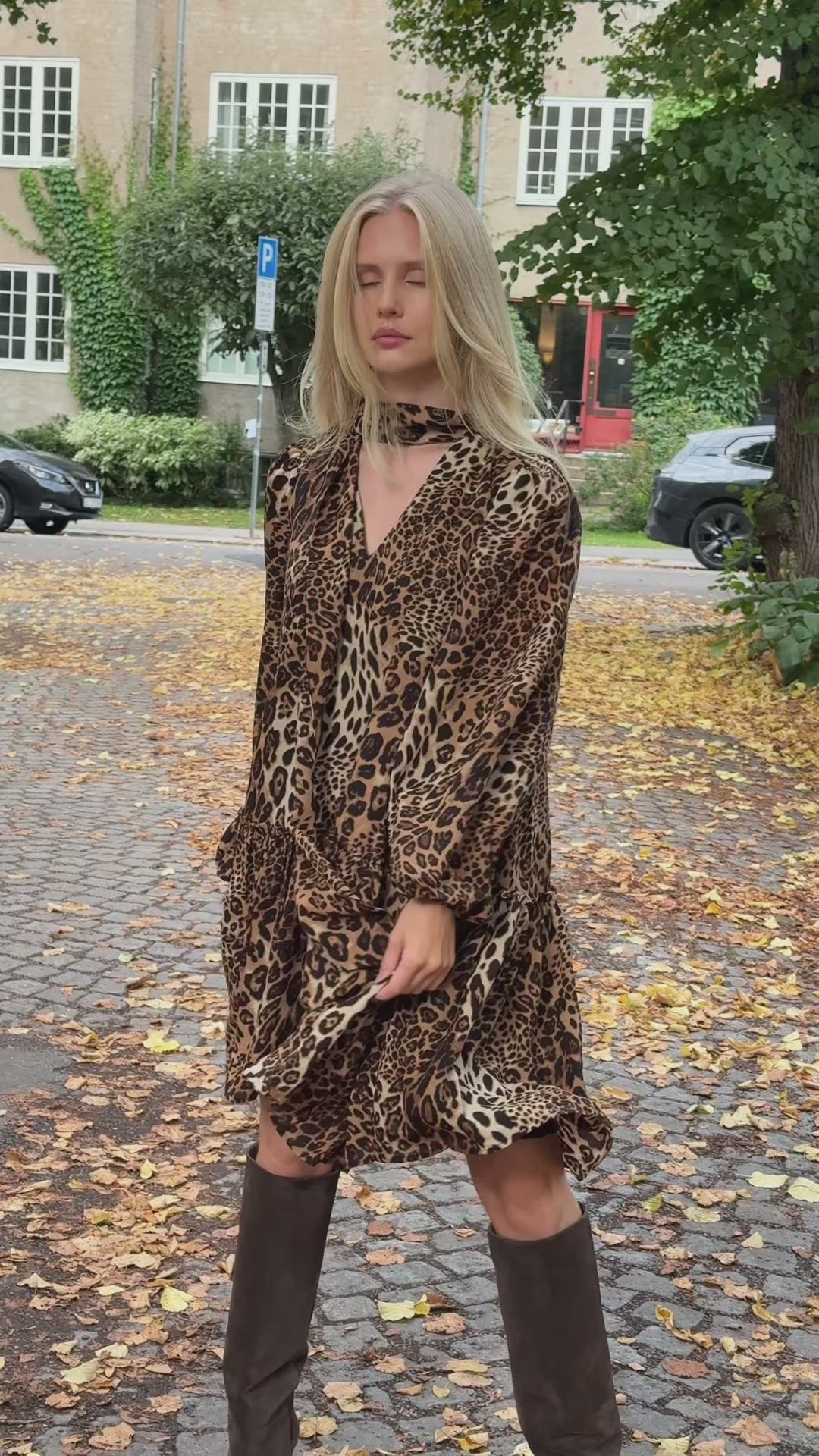 Jofrid Bow Mini Dress fra OSMINE af nor. En leken og iøynefallende minikjole med leopardmønster. Kjolen har løs passform med voluminøse ermer og skjørt med rysjer som gir bevegelse. Den dype V-utringningen kompletteres av et knytebånd som kan brukes som sløyfe eller la henge for en mer avslappet look. Perfekt både til hverdags med boots eller til kvelden med hæler.