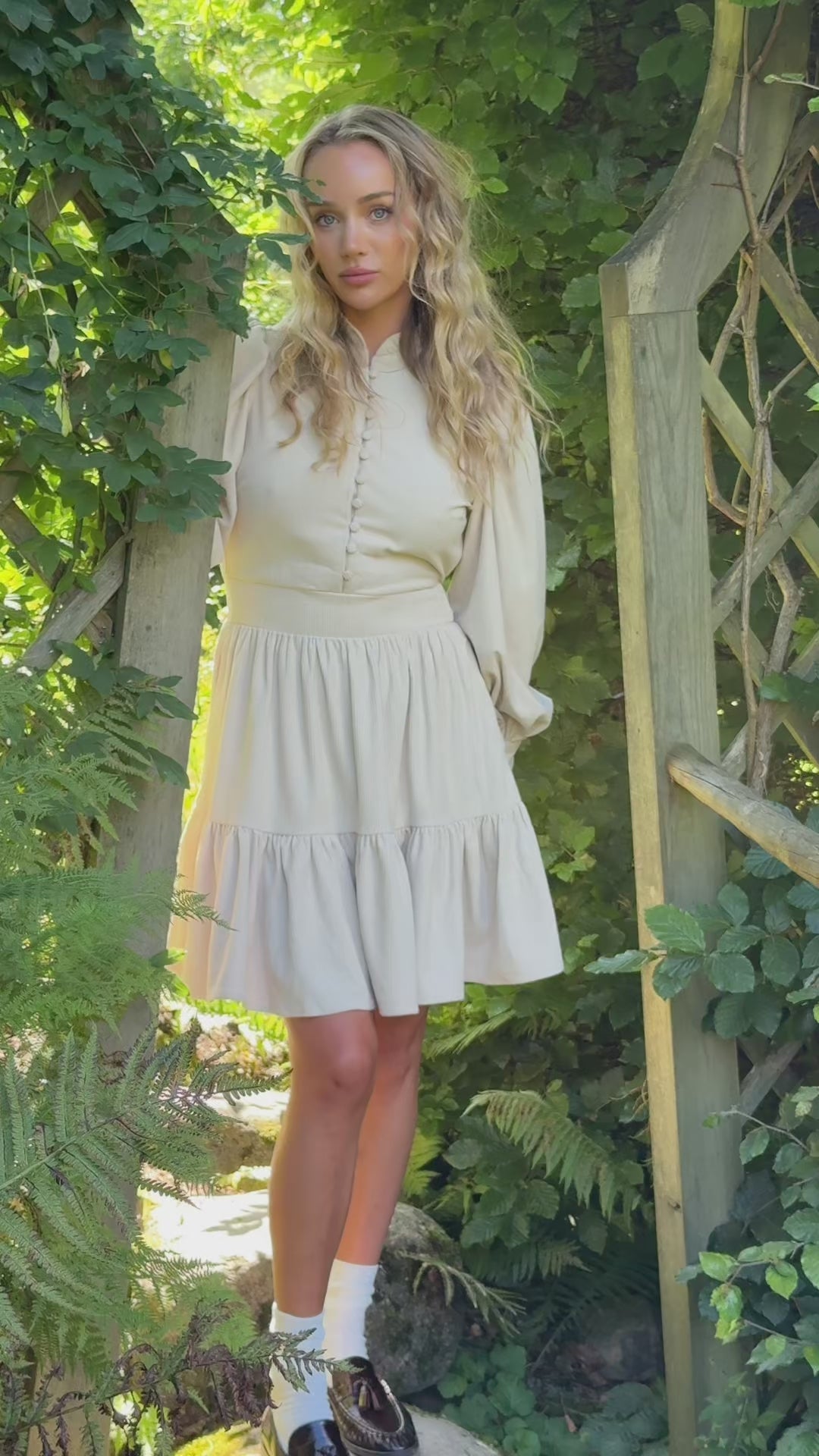 Liv Cord Solid Dress fra OSMINE af nor. En nydelig cordkjole fra norske OSMINE af nor. Liv Cord Solid Dress har lange ballongermer med puff på skuldrene og høy mansjett med stoffkledde knapper. Kjolen har en liten rysjekant i halsen og stoffkledde knapper til midjen. Midjen er definert med et bredt bånd i midjen med smock i ryggen. Kjolen har et kort, flowy A-skjørt med en volangkant for ekstra volum.