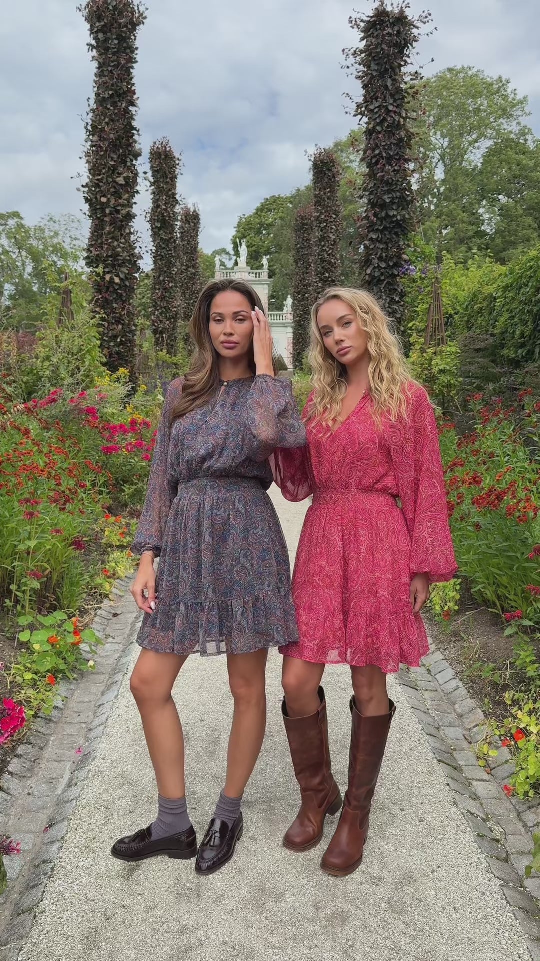 Raina Chiffon Dress fra OSMINE af nor. Vakker kjole fra norske OSMINE af nor med paisleyprint i nydelige høstfarger. Kjolen har rund hals med knappelukking foran, lange semitransparente ermer og en markert midje med smock i ryggen som gir en flatterende fasong. Skjørtet har lett volangkant som gir bevegelse og et feminint uttrykk.