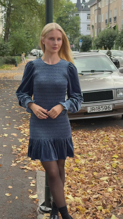 Rira Smock Velour Dress fra OSMINE af nor. En feminin og tidløs velourkjole i en nydelig blå nyanse. Kjolen har smockdetaljer som former silhuetten på en flatterende måte, kombinert med lange puffede ermer og rund hals. Skjørtet avsluttes med en liten volangkant som tilfører et lekent preg. Et perfekt plagg for både hverdags og fest, med en balansert miks av komfort og eleganse.